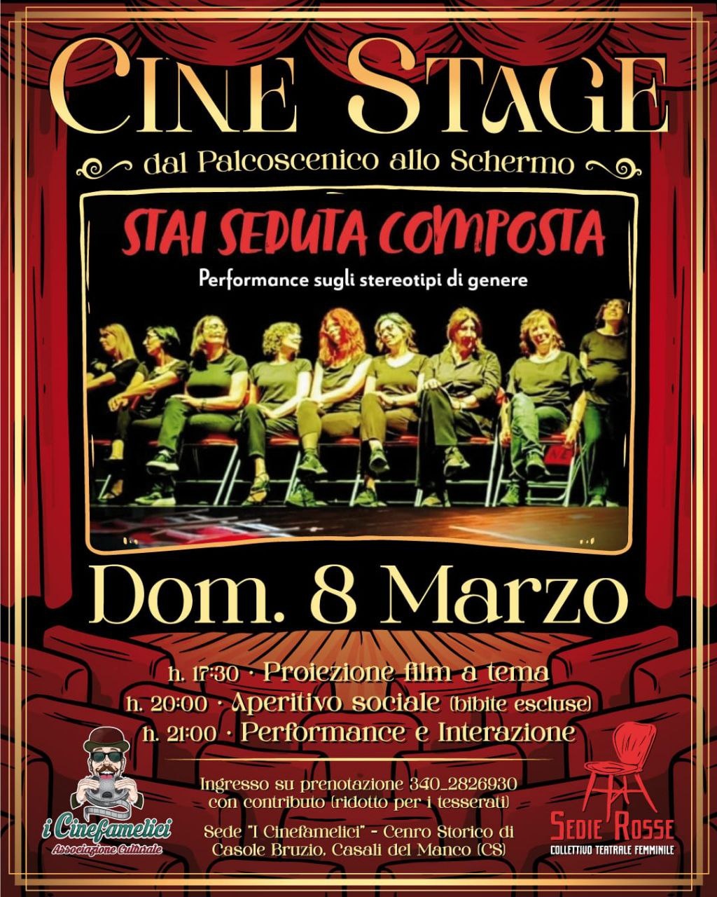 DOM. 8 MARZO - In occasione della Giornata internazionale della donna, ospiteremo in sede il collettivo teatrale femminile SEDIE ROSSE nato a Cosenza dall'incontro fortunato di un gruppo di donne che hanno scoperto la magia e la potenza del teatro, sotto la guida esperta e sensibile di Teresa Bruno.