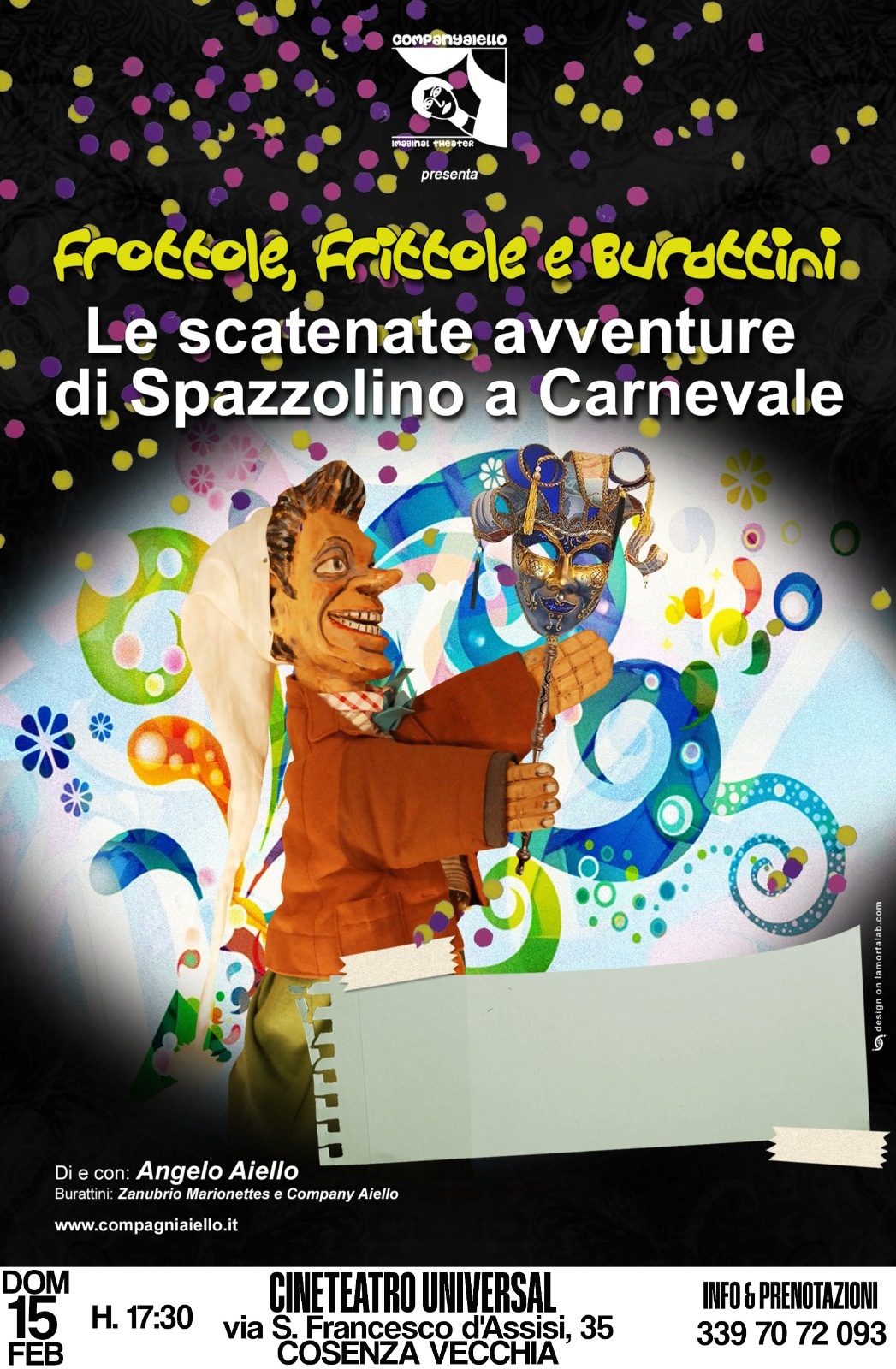 Spettacolo di burattini vivace e irriverente, dove il Carnevale rivive nei lazzi, bastonate liberatorie e risate fragorose. Ispirato alla tradizione dei burattini napoletani, emiliano-romagnoli, alla Commedia dell’Arte e alle fiabe popolari, lo spettacolo mescola linguaggi antichi e sensibilità contemporanea. Protagonista è Spazzolino, eroe popolare dalla testa di legno. Nato in una periferia calabrese, Spazzolino inciampa quotidianamente nei soprusi dei prepotenti e finisce immancabilmente nei guai.