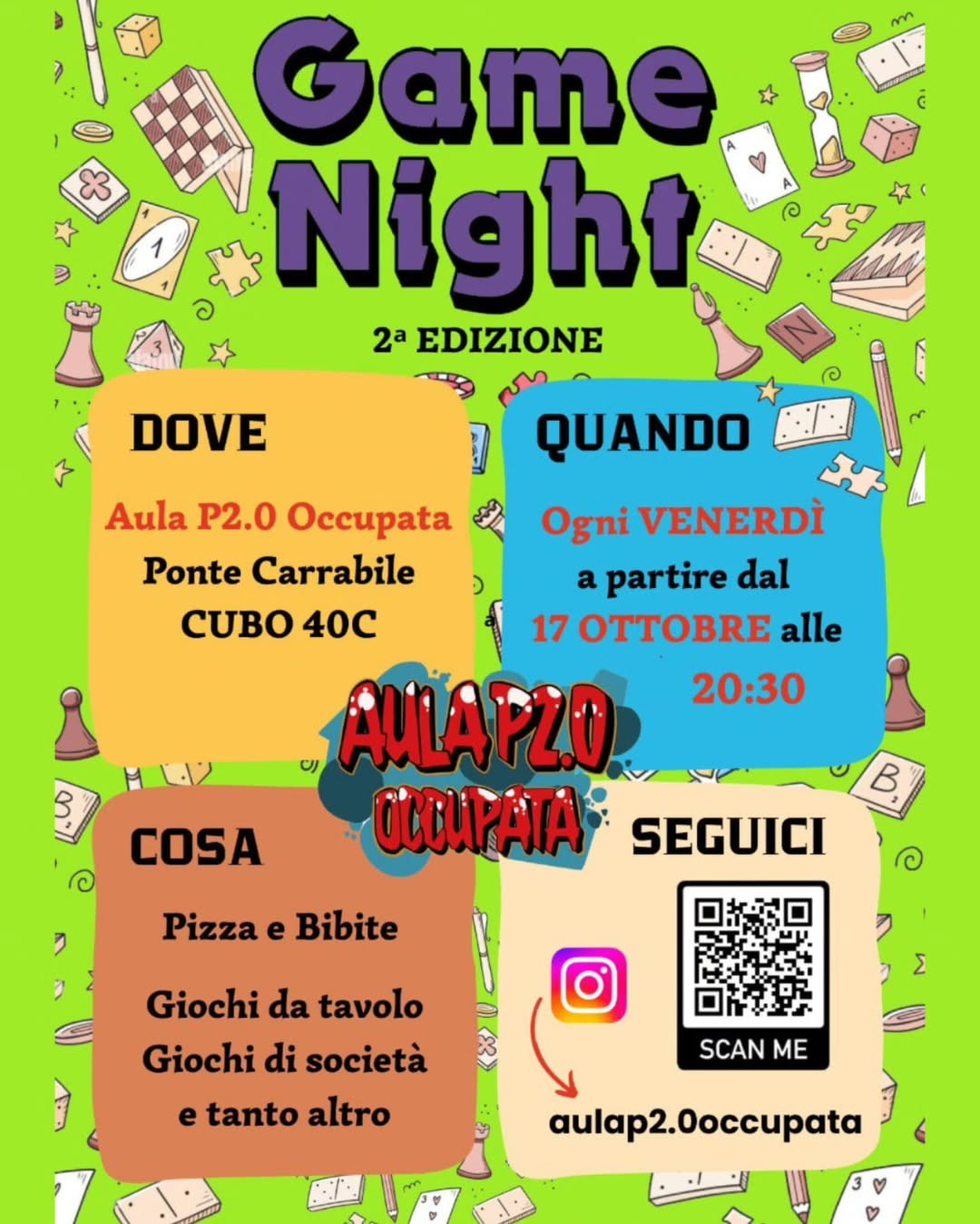 La seconda edizione della "Game Night" in Aula P2.0 Occupata, per info su questa e altre iniziative unisciti alla nostra community Telegram https://t.me/aulap2punto0community