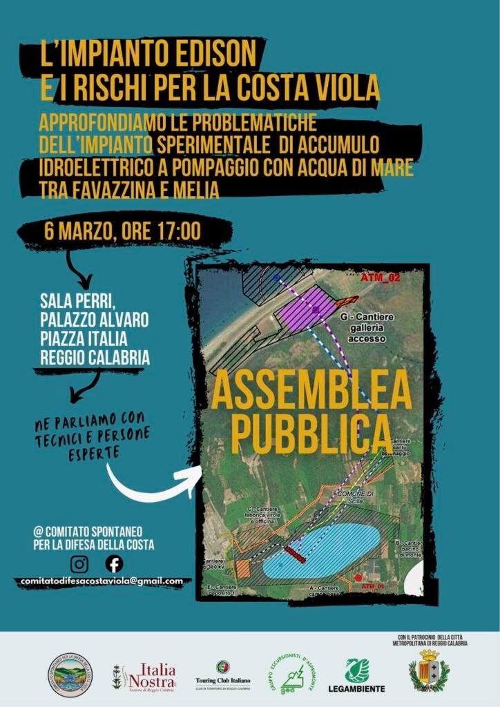 Il Comitato Spontaneo per la Difesa della Costa Viola ha indetto una nuova assemblea pubblica a Reggio Calabriail6 marzo 2026 alle ore 17:00presso la Sala Perri di Palazzo Alvaro sita a Piazza Italia per condividere analisi e rischi dell’ impianto di accumulo idroelettrico mediante pompaggio dell’acqua del mare, che il colosso dell’energia Edison S.p.A. vorrebbe realizzare tra la costa di Favazzina confinante con Bagnara ed il versante di Melia di Scilla. Progetto attualmente in attesa della Valutazione d’Impatto Ambientale da parte del Ministero dell’Ambiente e della Sicurezza Energetica.Un’occasione, dunque, per condividere anche gli ulteriori studi tecnici sulle criticità dell’opera, realizzati da esperti ed associazioni ambientaliste.